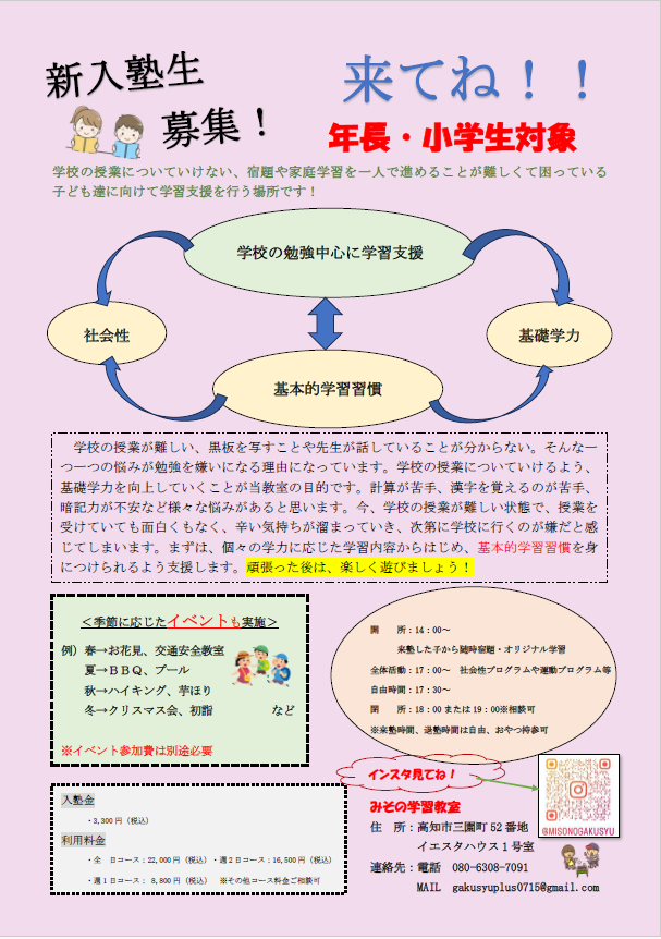 年長さん・小学生の児童さんが対象になりますが、勉強が苦手だったり、そもそも勉強のやり方が分からない方など、いろいろな事をご相談できるようです。