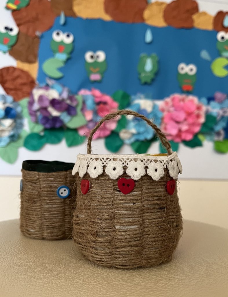 紙コップを使っていますが、器用に麻ひもを通してくれていますね♪